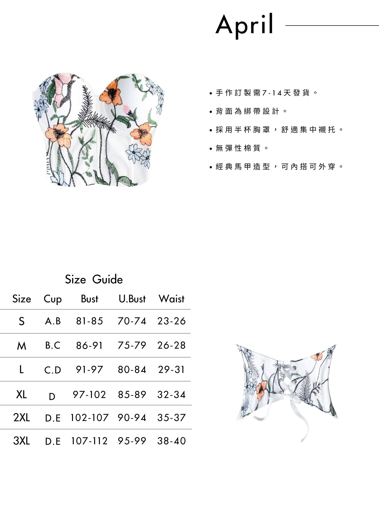 首頁 手作訂製系列 訂製手作馬甲 April Corset |April後背綁帶馬甲 April Corset |April後背綁帶馬甲 .手作訂製需7-14天發貨。 .背面為綁帶設計。 .採用半杯胸罩,舒適集中襯托。 .無彈性棉質。 .經典馬甲造型,可內搭可外穿。 NT$1,580 尺寸 請選取一個選項SMLXL2XL3XL清除 April Corset |April後背綁帶馬甲 數量 加入購物車 描述 額外資訊 尺寸 S, M, L, XL, 2XL, 3XL 相關商品 Brenda Corset | Brenda後背綁帶馬甲 NT$1,580 選擇規格 此產品有多種款式。 可在產品頁面選擇選項 Add to Wishlist Add to Wishlist Charlotte Corset | Charlotte後背綁帶馬甲 NT$1,680 選擇規格 此產品有多種款式。 可在產品頁面選擇選項 Add to Wishlist Add to Wishlist Rosalba Tanga Briefs | Rosalba Tanga三角褲 NT$680 原始價格:NT$680。NT$476目前價格:NT$476。 選擇規格 此產品有多種款式。 可在產品頁面選擇選項 Add to Wishlist Add to Wishlist Cosette Wireless Bra | Cosette薄款無鋼圈內衣 NT$990 原始價格:NT$990。NT$690目前價格:NT$690。 選擇規格 此產品有多種款式。 可在產品頁面選擇選項 Add to Wishlist Add to Wishlist