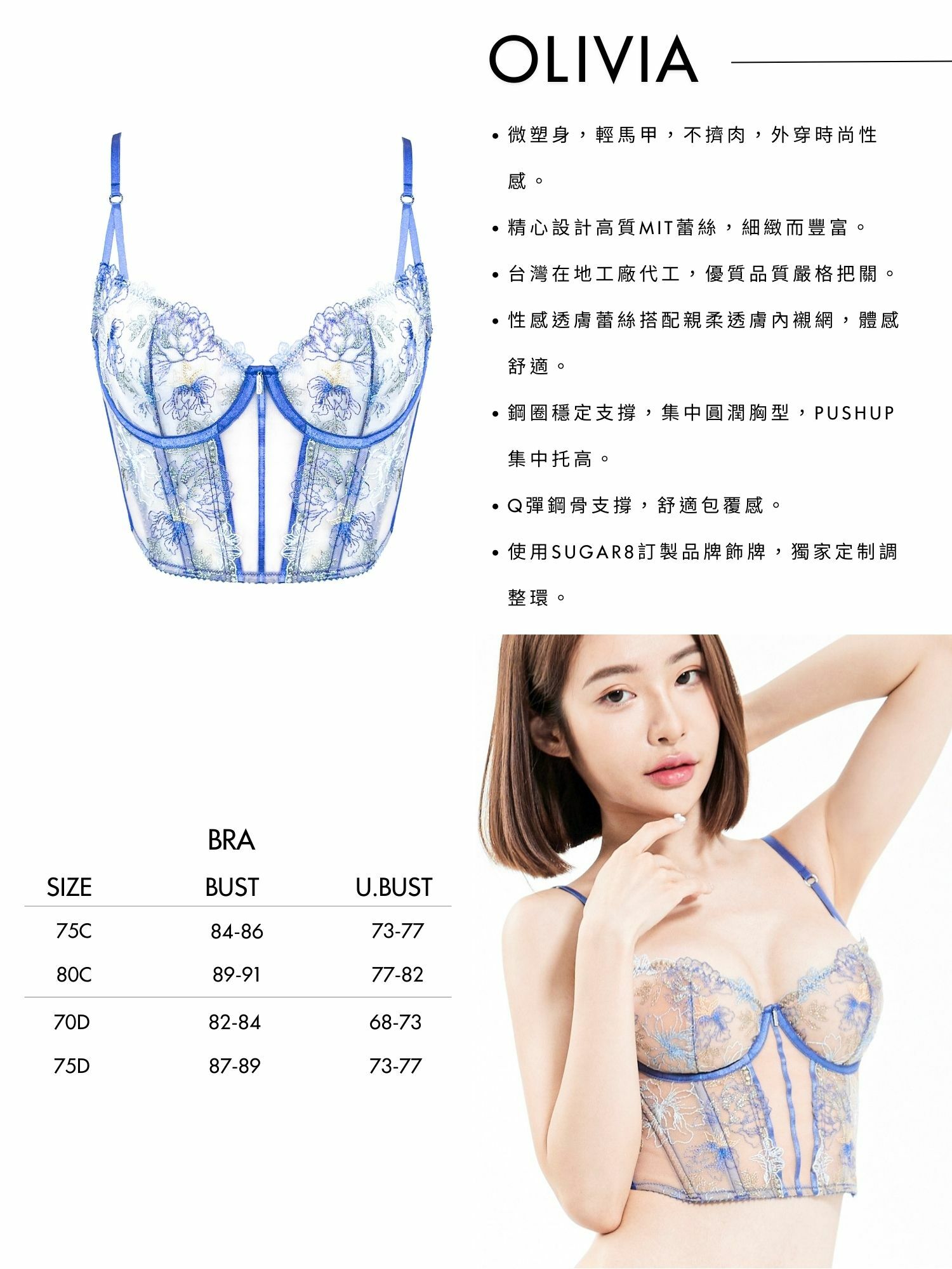 首頁 全部內衣 Olivia Sheer Corset| Olivia透膚馬甲 Olivia Sheer Corset| Olivia透膚馬甲 .為台灣女性量身打造版型。 .精心設計高質MIT蕾絲,細緻而豐富。 .台灣在地工廠代工,優質品質嚴格把關。 .性感透膚蕾絲搭配親柔透膚內襯網,體感舒適。 .鋼圈穩定支撐,集中圓潤胸型,PUSHUP集中托高。 .Q彈鋼骨支撐,舒適包覆感。 .使用SUGAR8訂製品牌飾牌,獨家定制調整環。 NT$3,680 尺寸 請選取一個選項75C80C70D75D清除 Olivia Sheer Corset| Olivia透膚馬甲 數量 加入購物車 描述 額外資訊 尺寸 75C, 80C, 70D, 75D 相關商品 Araya Corset | Araya後背綁帶馬甲 NT$1,580 選擇規格 此產品有多種款式。 可在產品頁面選擇選項 Add to Wishlist Add to Wishlist Rosery Classics Bra | Rosery經典款內衣 NT$2,580 選擇規格 此產品有多種款式。 可在產品頁面選擇選項 Add to Wishlist Add to Wishlist Olivia Designed ¾ Bra | Olivia隨型款內衣 NT$3,680 選擇規格 此產品有多種款式。 可在產品頁面選擇選項 Add to Wishlist Add to Wishlist Rosery Corset | Rosery輕馬甲 NT$3,680 選擇規格 此產品有多種款式。 可在產品頁面選擇選項 Add to Wishlist Add to Wishlist