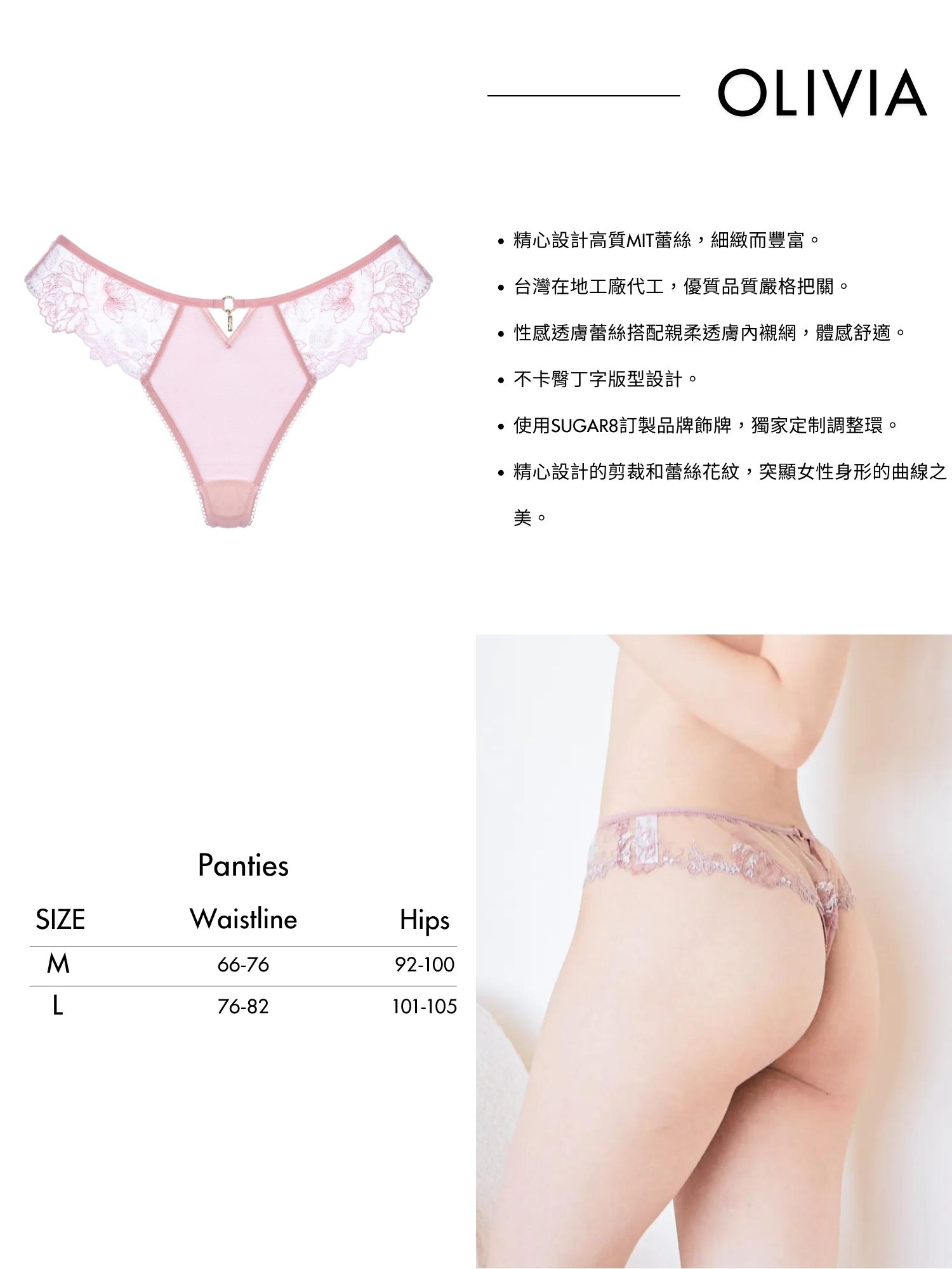 首頁 全部內褲 丁字褲 Olivia Thong | Olivia丁字褲 Olivia Thong | Olivia丁字褲 .為台灣女性量身打造版型。 .精心設計高質MIT蕾絲,細緻而豐富。 .台灣在地工廠代工,優質品質嚴格把關。 .性感透膚蕾絲搭配親柔透膚內襯網,體感舒適。 .不卡臀丁字版型設計。 .使用SUGAR8訂製品牌飾牌,獨家定制調整環。 .精心設計的剪裁和蕾絲花紋,突顯女性身形的曲線之美。 NT$1,980 尺寸 請選取一個選項ML清除 Olivia Thong | Olivia丁字褲 數量 加入購物車 描述 額外資訊 尺寸 M, L 相關商品 Raven Thong | Raven丁字褲 NT$1,380 選擇規格 此產品有多種款式。 可在產品頁面選擇選項 Add to Wishlist Add to Wishlist Rosery Tanga Briefs | Rosery Tanga三角褲 NT$1,280 選擇規格 此產品有多種款式。 可在產品頁面選擇選項 Add to Wishlist Add to Wishlist Olivia Designed Thong | Olivia設計款丁字褲 NT$1,380 選擇規格 此產品有多種款式。 可在產品頁面選擇選項 Add to Wishlist Add to Wishlist Mintara Briefs | Mintara三角褲 NT$680 原始價格:NT$680。NT$390目前價格:NT$390。 選擇規格 此產品有多種款式。 可在產品頁面選擇選項 Add to Wishlist Add to Wishlist