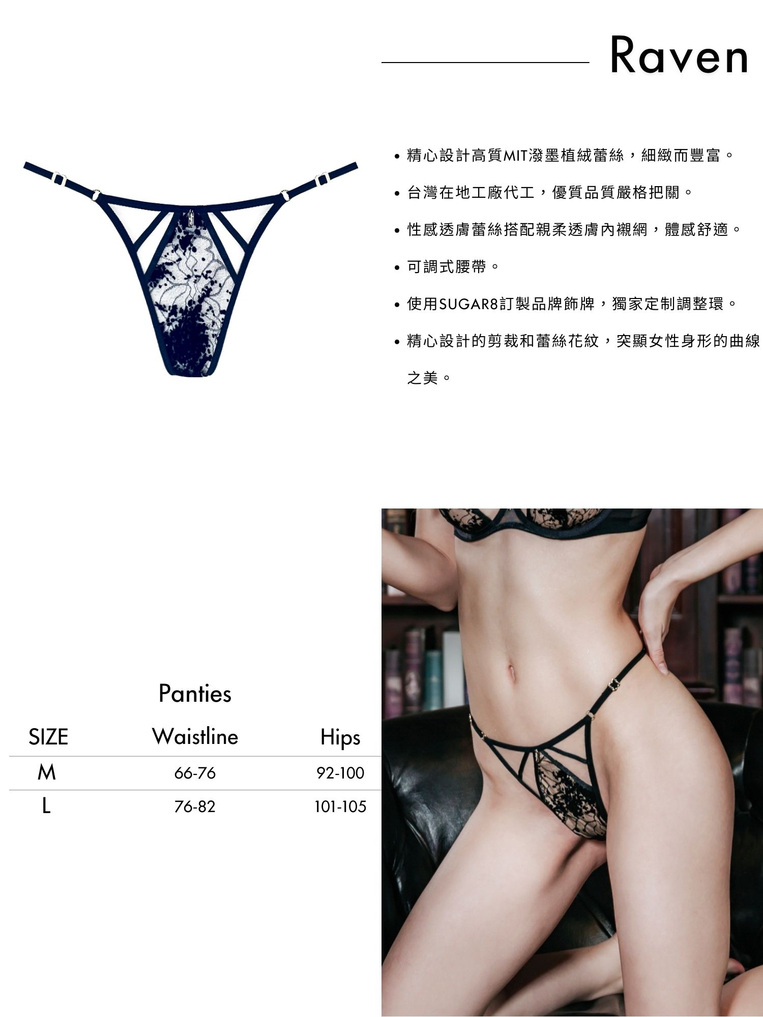 首頁 全部內褲 丁字褲 Raven Thong | Raven丁字褲 Raven Thong | Raven丁字褲 .為台灣女性量身打造版型。 .精心設計高質MIT潑墨植絨蕾絲,細緻而豐富。 .台灣在地工廠代工,優質品質嚴格把關。 .性感透膚蕾絲搭配親柔透膚內襯網,體感舒適。 .可調式腰帶。 .使用SUGAR8訂製品牌飾牌,獨家定制調整環。 .精心設計的剪裁和蕾絲花紋,突顯女性身形的曲線之美。 NT$1,380 尺寸 請選取一個選項ML清除 Raven Thong | Raven丁字褲 數量 加入購物車 描述 額外資訊 尺寸 M, L 相關商品 Arylin丁字褲 NT$680 選擇規格 此產品有多種款式。 可在產品頁面選擇選項 Add to Wishlist Add to Wishlist Olivia Thong | Olivia丁字褲 NT$1,980 選擇規格 此產品有多種款式。 可在產品頁面選擇選項 Add to Wishlist Add to Wishlist Olivia Thong | Olivia丁字褲 NT$1,980 選擇規格 此產品有多種款式。 可在產品頁面選擇選項 Add to Wishlist Add to Wishlist Rosery Thong | Rosery丁字褲 NT$1,280 選擇規格 此產品有多種款式。 可在產品頁面選擇選項 Add to Wishlist Add to Wishlist